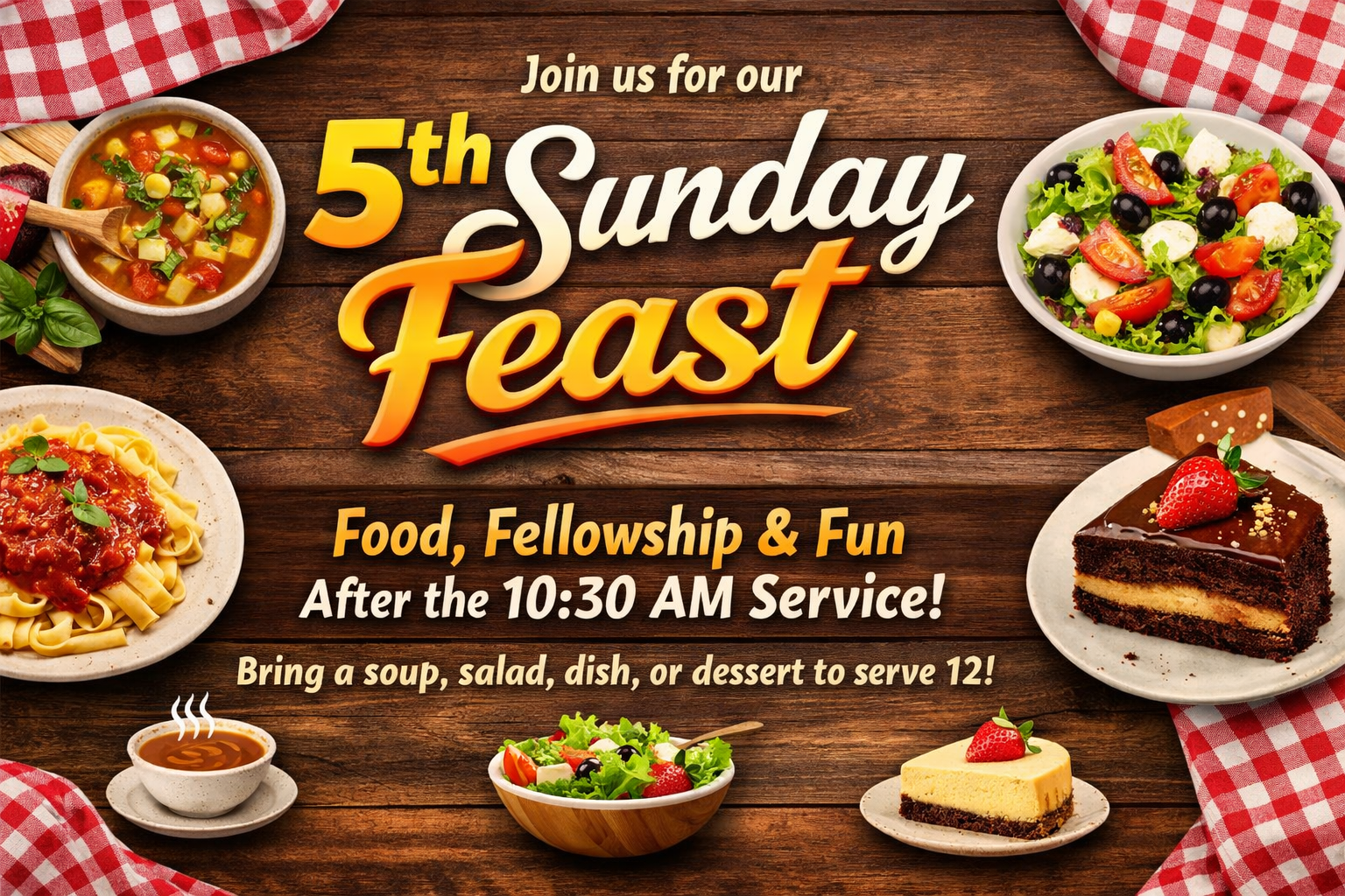 Gather around the table with friends and food! Join us for 5th Sunday Feast, a cozy lunch of community, laughter, and gratitude.